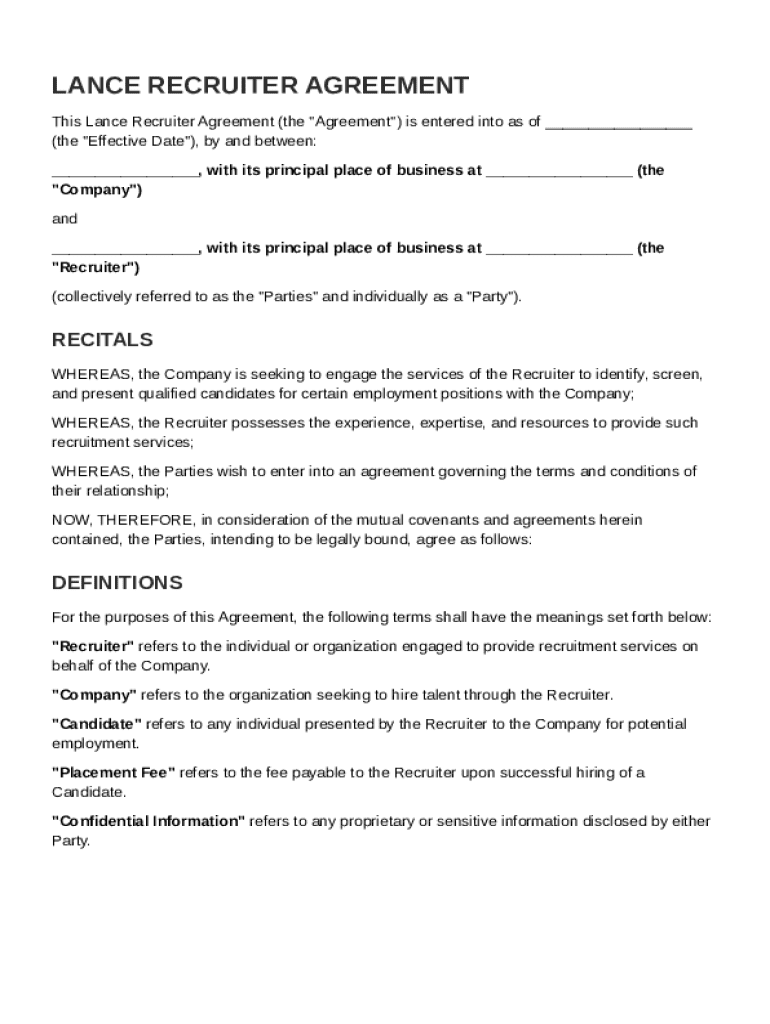 The Lance Recruiter Agreement Template is a document that outlines the terms and conditions between a recruiter and an employer regarding recruitment services.