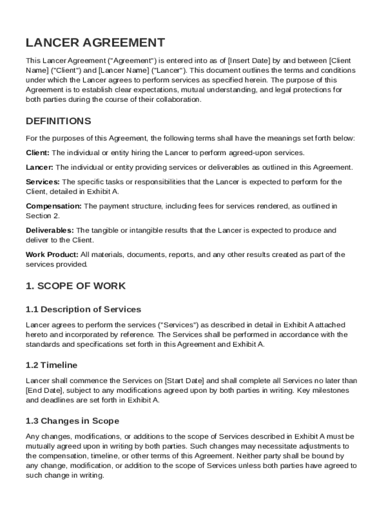This document outlines the terms and conditions under which the Lancer agrees to perform services for the Client, establishing clear expectations and legal protections for both parties.