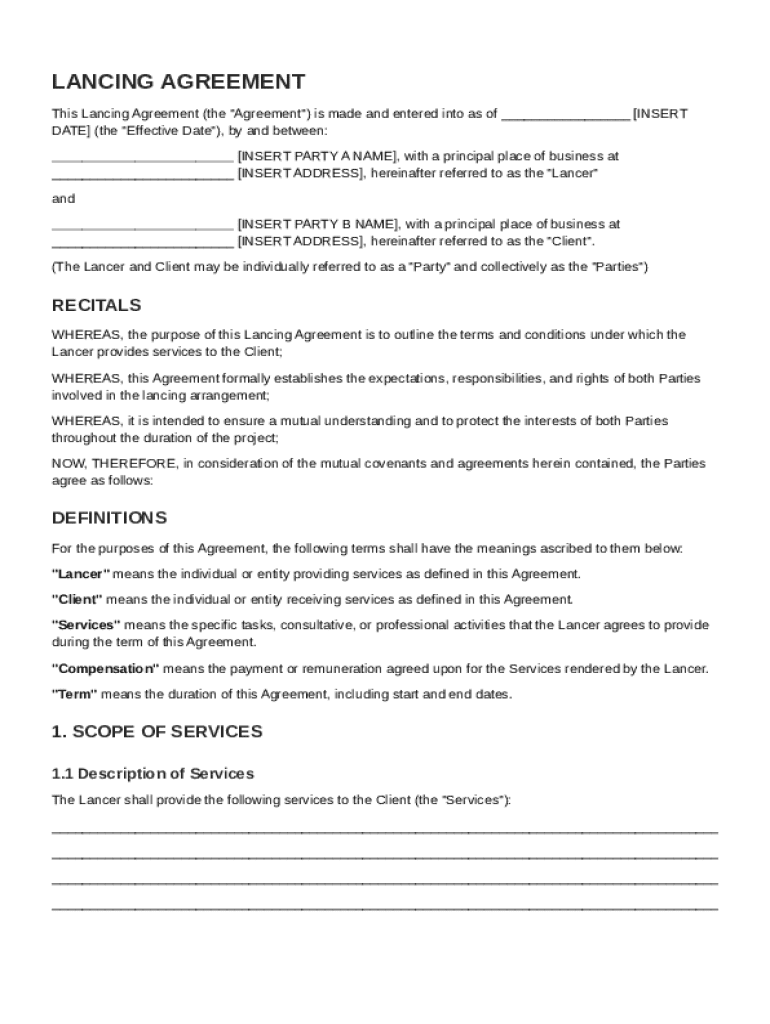 A typical Lancing Agreement consists of several key sections that clarify the expectations and responsibilities of both parties. Understanding these sections is vital for crafting an effective agreement.