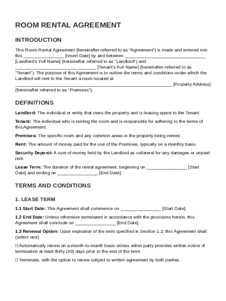 Essential terms such as 'Premises' refers to the room being rented, while 'Lease Term' defines the duration of the rental agreement.