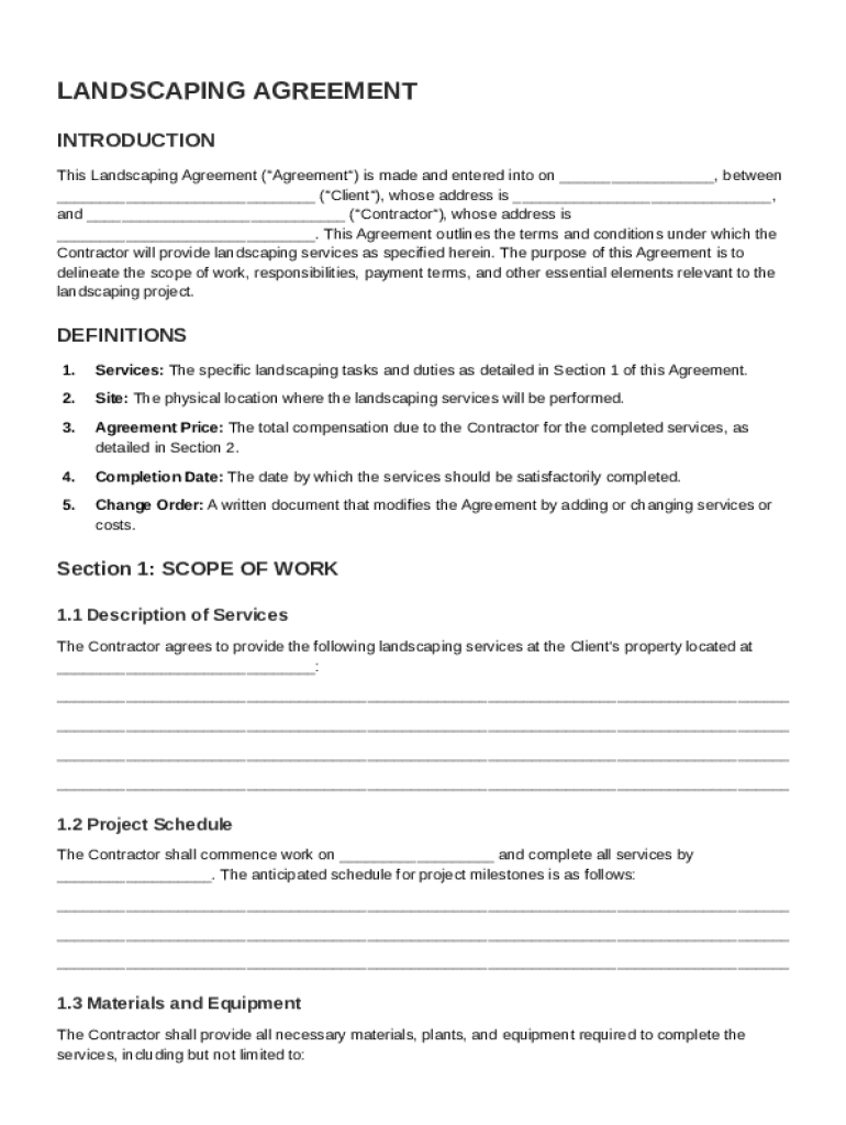 This agreement outlines the terms and conditions for landscaping services between a client and a contractor, including scope of work, responsibilities, payment terms, and warranties.