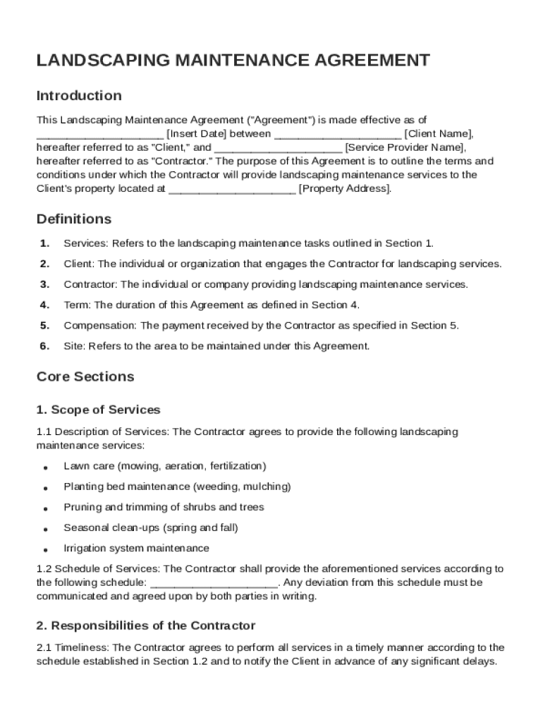 A Landscaping Maintenance Agreement Template is a formal document outlining the terms and conditions for landscaping services between a service provider and a client.