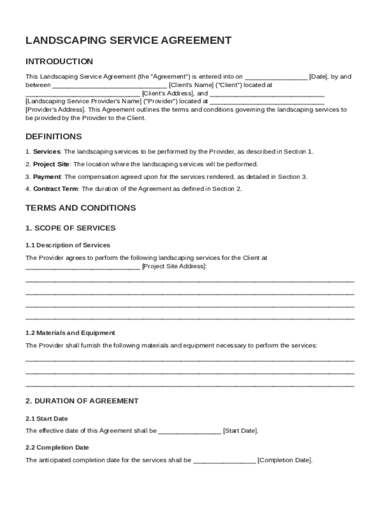 This agreement outlines the terms and conditions for landscaping services between a client and a service provider, including definitions, responsibilities, payment terms, and dispute resolution.