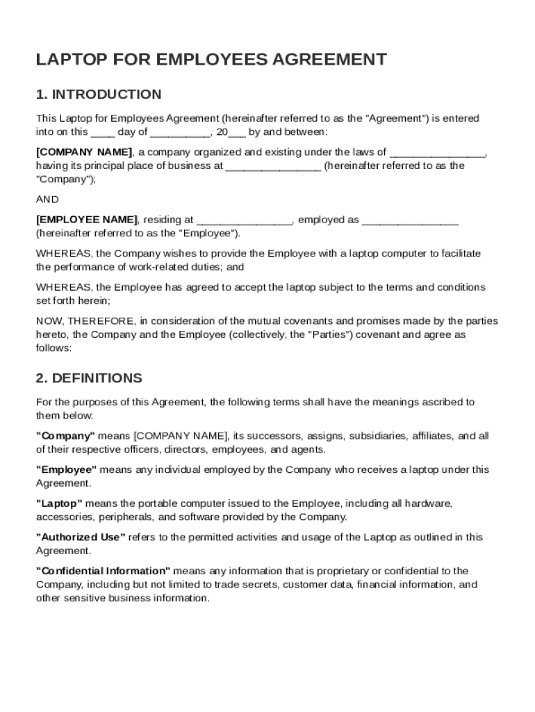 This section provides essential information regarding the Laptop for Employees Agreement Template, including its purpose and key provisions.