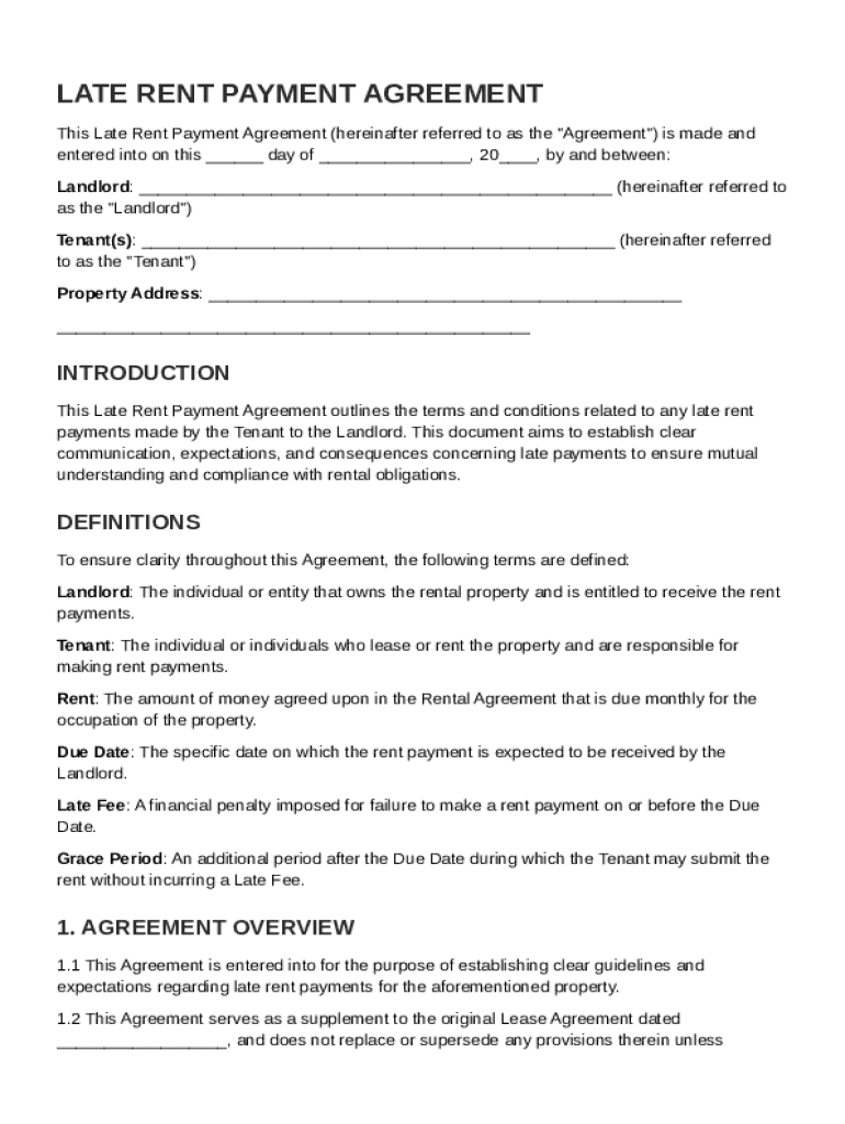 A Late Rent Payment Agreement Template is a written document outlining the terms and conditions for a tenant to pay overdue rent, including potential penalties and payment schedules.