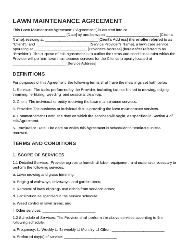 A Lawn Maintenance Agreement Template is a formal contract outlining the terms and conditions for lawn care services between a provider and a client.