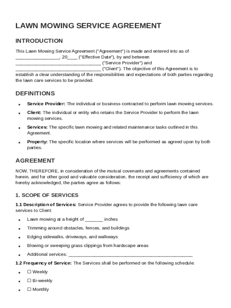 A Lawn Mowing Service Agreement Template is a formal document outlining the terms and conditions for lawn mowing services between a provider and a client.
