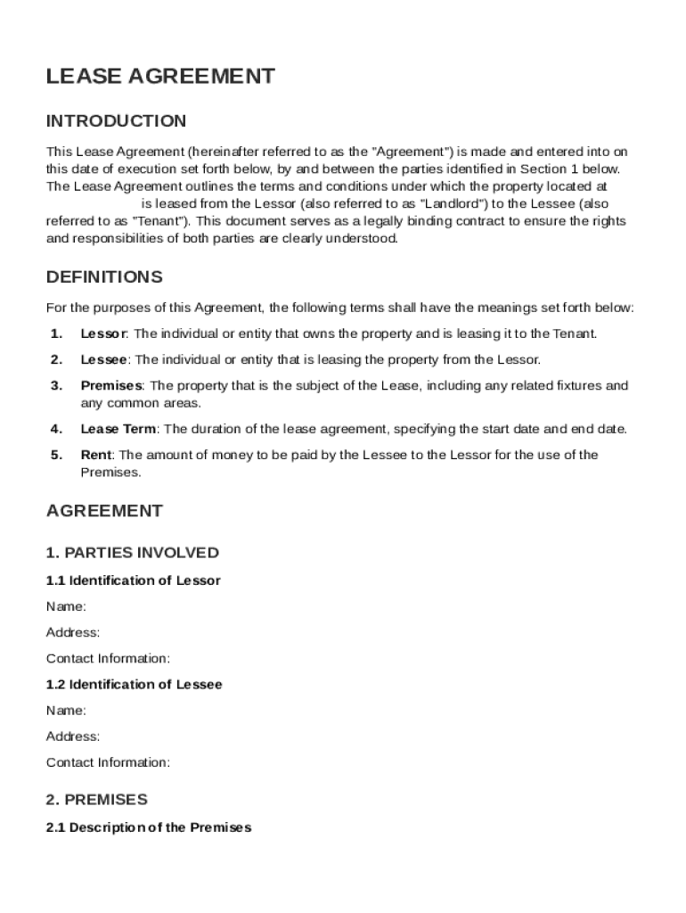 This Lease Agreement outlines the terms and conditions under which a property is leased from the Lessor (Landlord) to the Lessee (Tenant), serving as a legally binding contract to ensure both parties\'