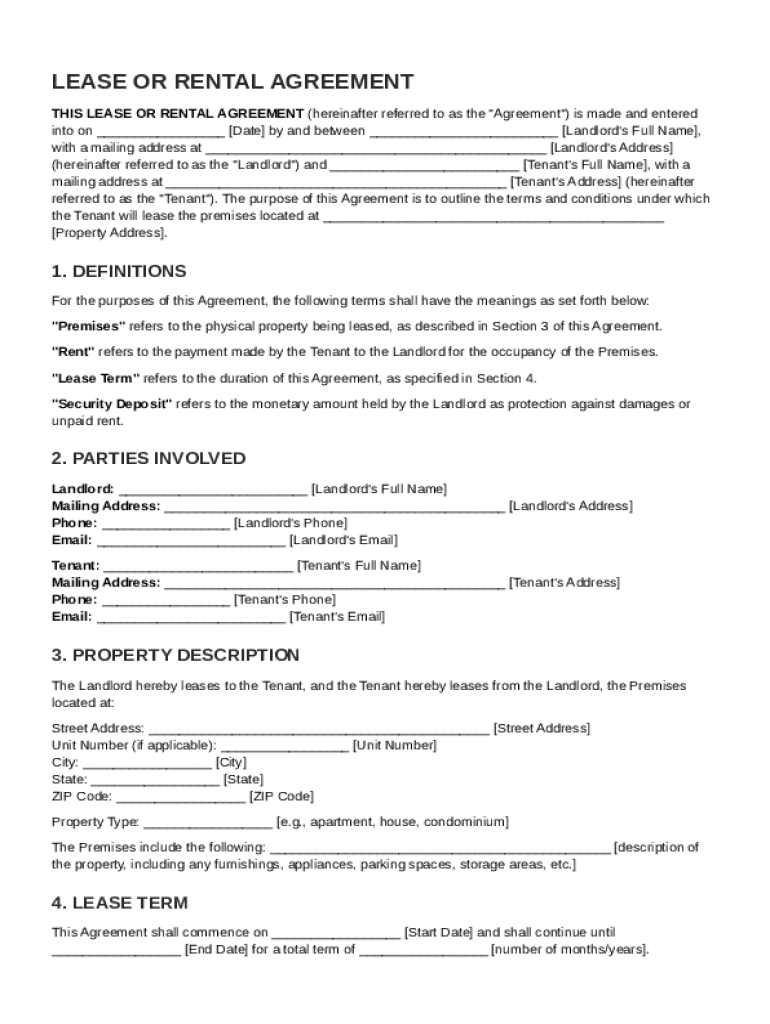 A lease or rental agreement is a legally binding contract between a landlord and tenant outlining the terms under which a property is rented. Its primary purpose is to protect the rights of both parties, detailing responsibilities such as payment and property maintenance. Having a formal lease agreement safeguards both parties from potential disputes.