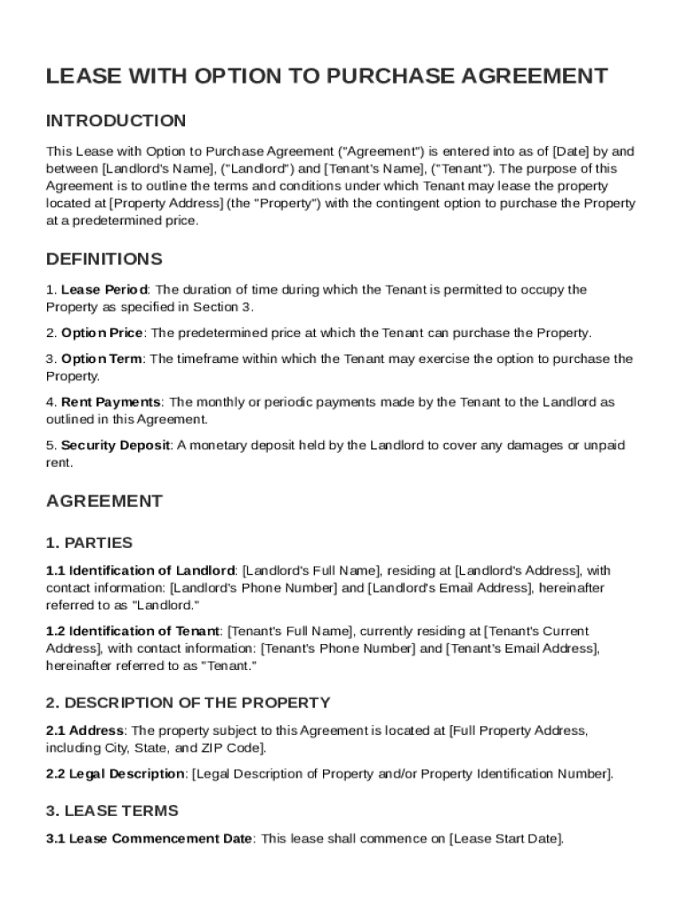 This Agreement outlines the terms and conditions under which Tenant may lease the property with the option to purchase at a predetermined price.
