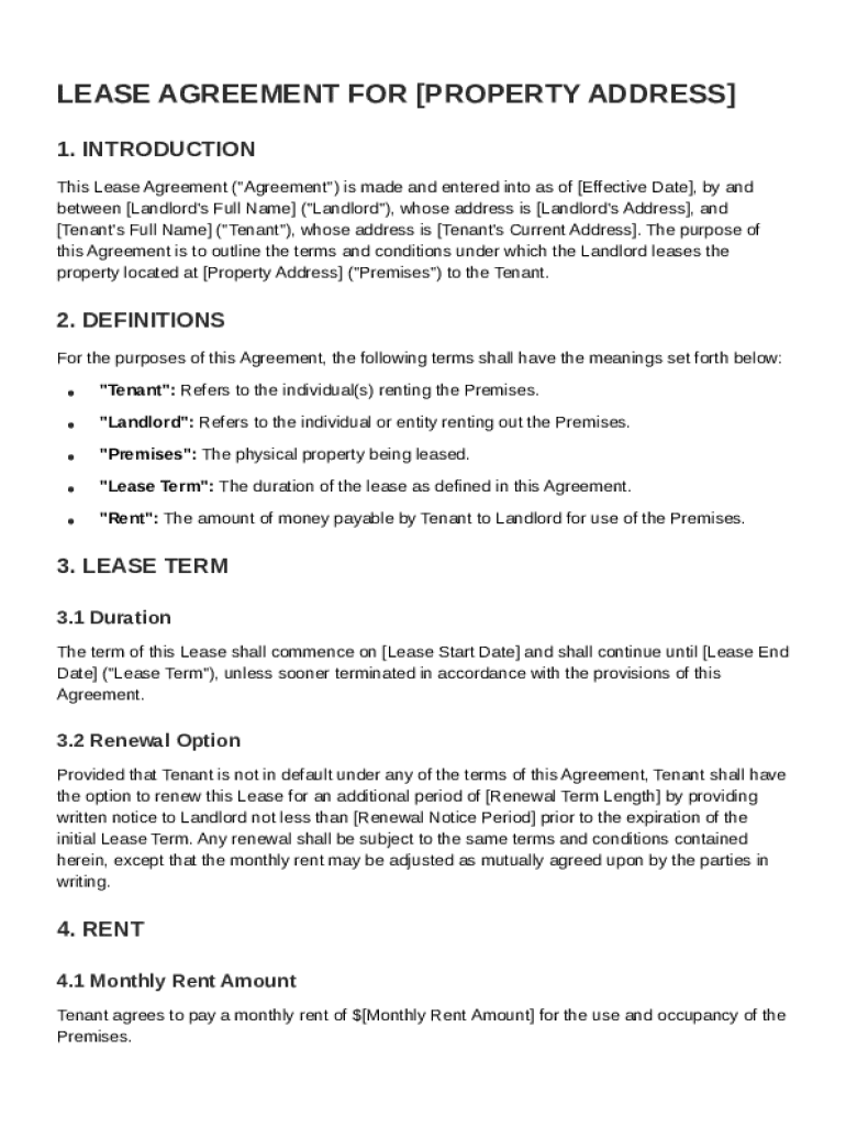 Essential Elements of a Lease for Property Agreement include critical definitions and clauses that ensure both parties are on the same page. For instance, understanding terms like 'Tenant', 'Landlord', 'Premises', and 'Rent' is vital. Additionally, important clauses such as the Lease Term and Security Deposits can define the financial and temporal boundaries of the relationship.