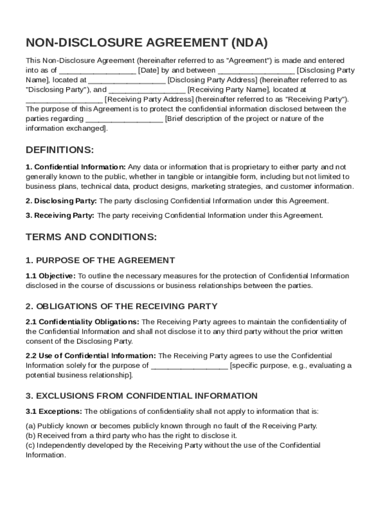 Confidential Information: Clearly outlines what information is considered confidential and covered under the NDA.