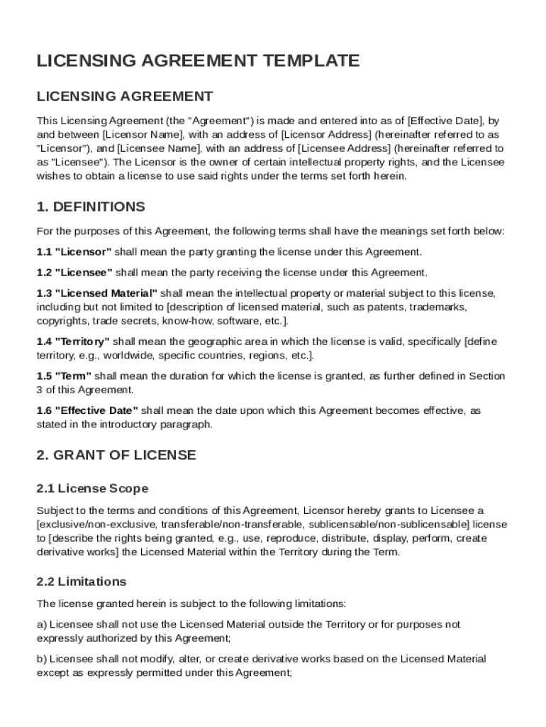 A licensing agreement is a legal contract between two parties, typically characterized by a grant of rights from the licensor to the licensee regarding the use of certain intellectual property or resources. It's vital to have a licensing agreement in place to protect your rights and define how materials can be used to avoid misuse, ensuring a harmonious business relationship.