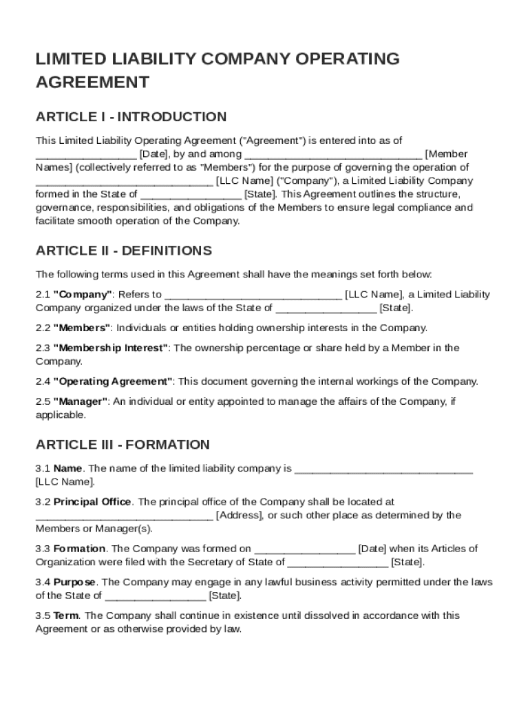 This document serves as an Operating Agreement for a Limited Liability Company, outlining the structure, governance, and responsibilities of its Members.