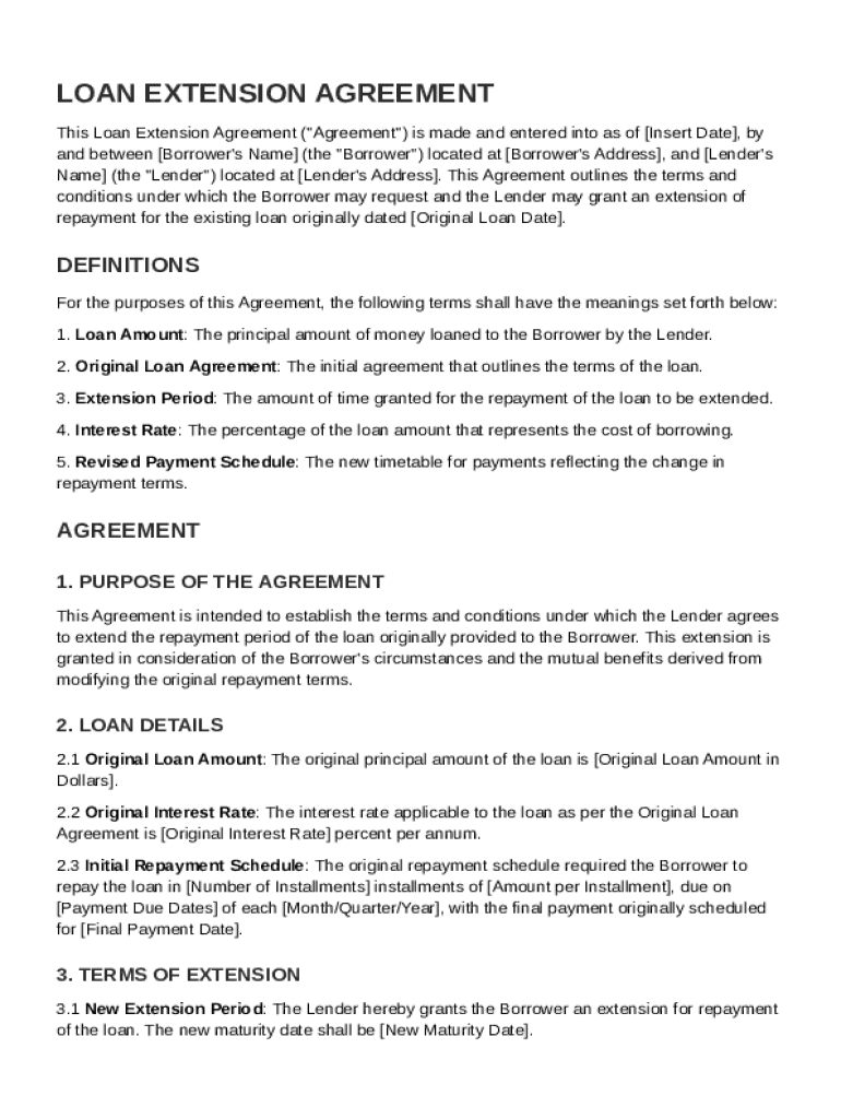 A Loan Extension Agreement Template is a legal document that outlines the terms for extending the repayment period of an existing loan.