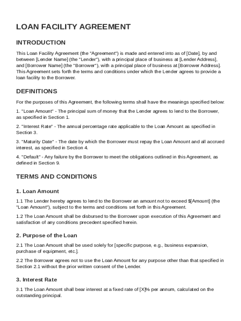This document outlines the terms and conditions under which a lender provides a loan facility to a borrower, including loan amount, interest rate, repayment terms, and obligations of both parties.
