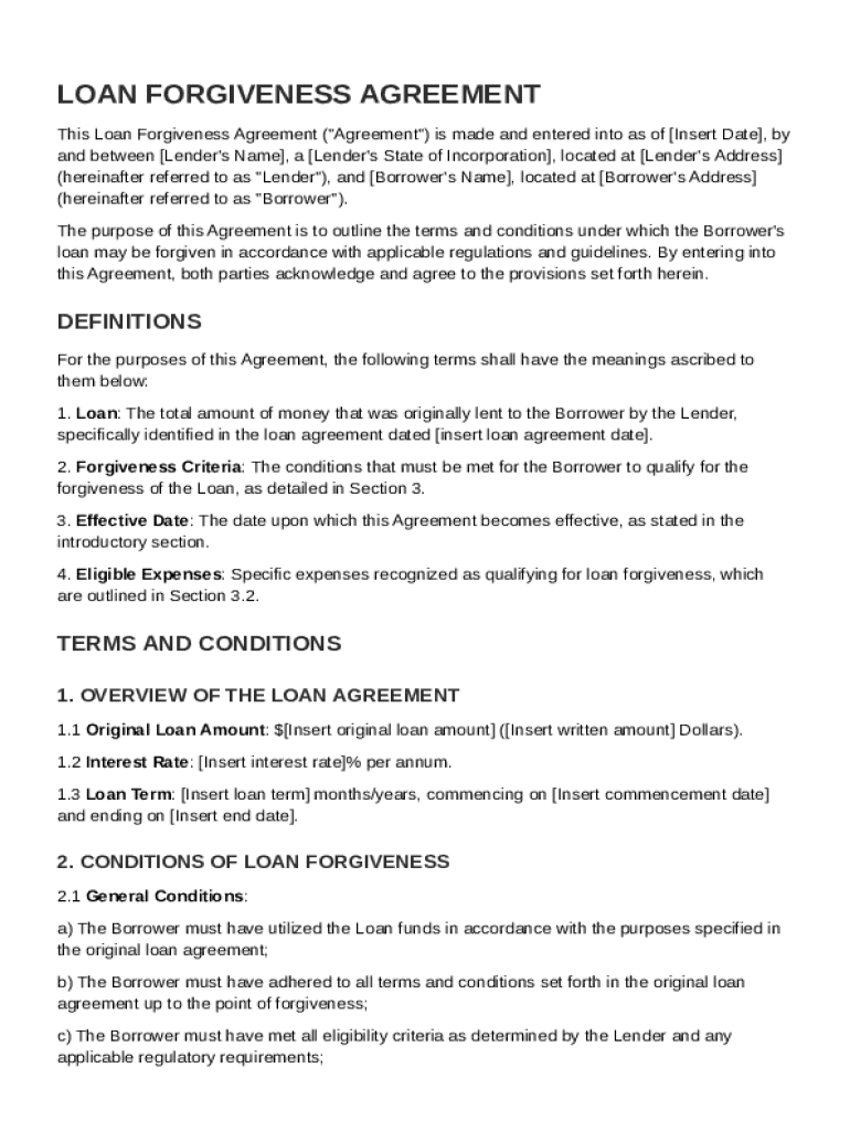 A Loan Forgiveness Agreement Template is a formal document that outlines the terms and conditions under which a borrower may have their loan forgiven.