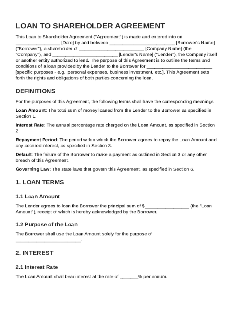 This Agreement outlines the terms and conditions of a loan provided by the Lender to the Borrower, a shareholder, including definitions of loan terms, repayment obligations, and governing law.