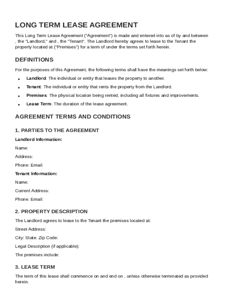 A Long Term Lease Agreement is a legally binding contract between a landlord and tenant specifying the terms of renting a property for an extended period, usually exceeding a year. These agreements are crucial as they protect the rights and responsibilities of both parties and help prevent potential disputes.