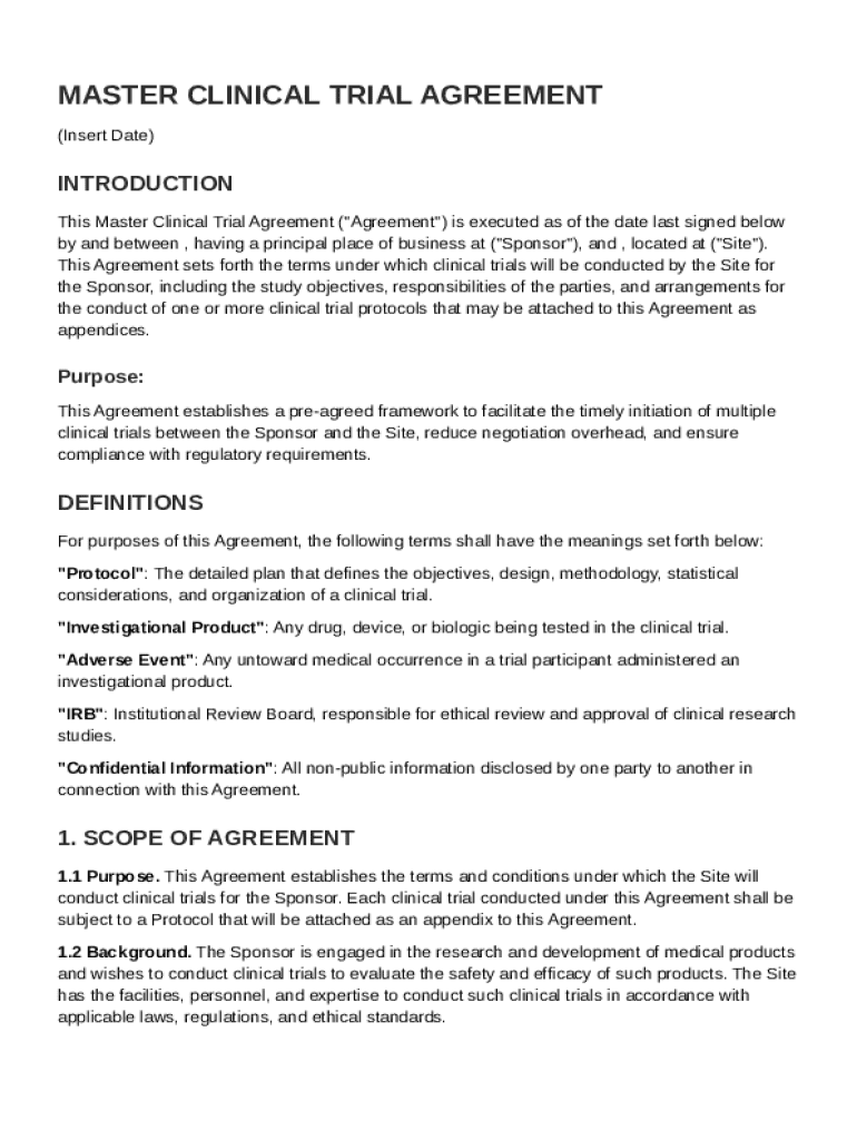 A Master Clinical Trial Agreement Template is a legal document that outlines the terms and conditions governing clinical trial collaborations between sponsors and clinical research sites.