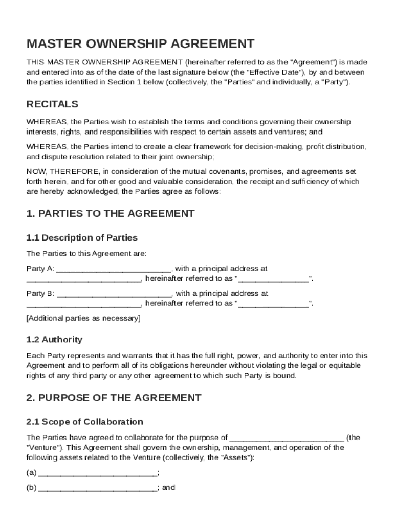 A Master Ownership Agreement Template is a legal document outlining the terms of ownership and responsibilities among parties in a joint venture or partnership.