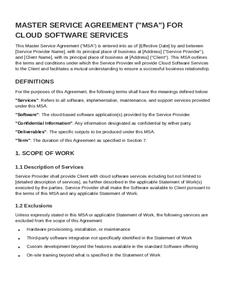 A Master Service Agreement (MSA) serves as the framework for a business relationship between a service provider and a client in the cloud software sector. This agreement outlines the general terms governing future transactions, which can include software development and service provisioning.