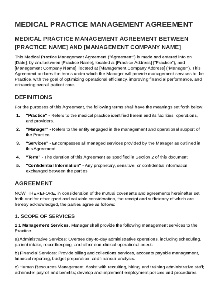 This document outlines the terms under which a management company will provide management services to a medical practice, focusing on optimizing operations, financial performance, and patient care.