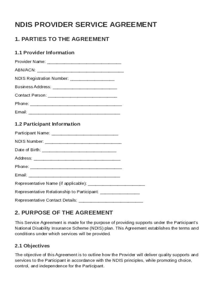 A comprehensive service agreement should capture vital information about both the provider and the participant. This includes details like the provider's Australian Business Number (ABN) and NDIS Registration Number, along with personal information of the participant.