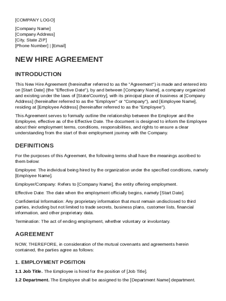 A New Hire Agreement Template is a formal document outlining the terms of employment between an employer and a new employee.