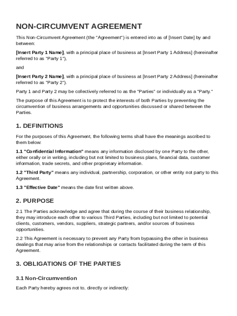 A Non Circumvent Agreement (NCA) is a contract that prevents one party from circumventing the other in business dealings, particularly when sensitive information is shared. This agreement serves a crucial role in protecting confidential business dealings and trade secrets. Often utilized in various industries, NCAs safeguard the disclosing party's interests while encouraging collaboration and trust between the involved parties.