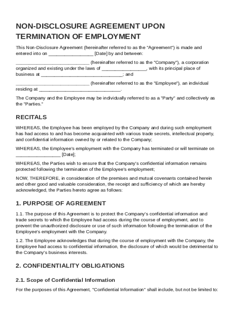 A comprehensive Non Disclosure When Leaving a Job Agreement consists of the following core sections:
