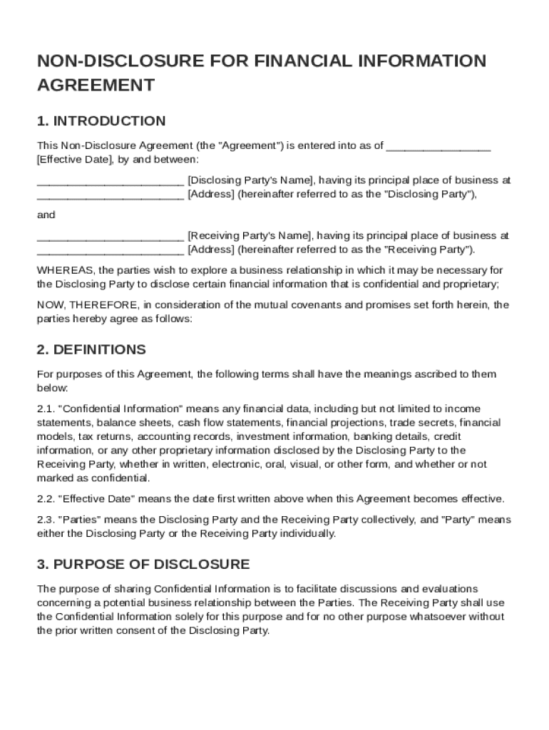 Non Disclosure for Financial Ination Agreement Template free printable template
