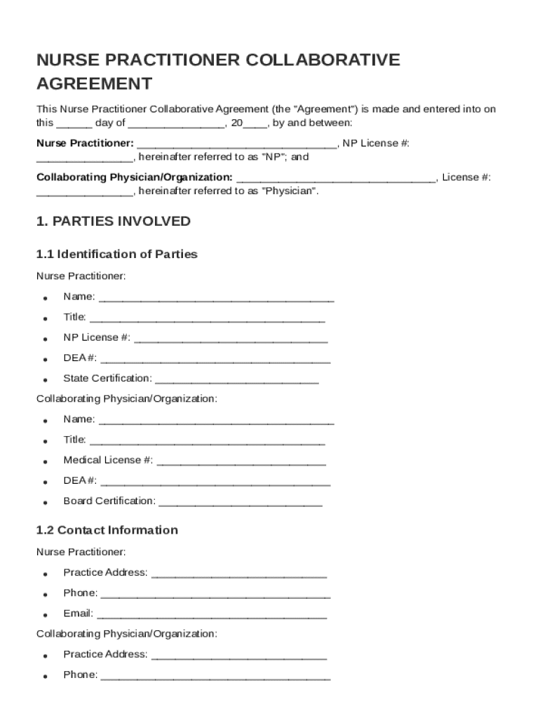 Main sections and clauses of a Nurse Practitioner Collaborative Agreement Template