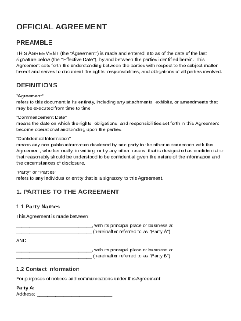 An official agreement comprises several key components that form the foundation of a legally sound contract. The preamble introduces the parties involved, establishing context. Furthermore, a definitions section is crucial as it clarifies specific terms that are fundamental to understanding the agreement.