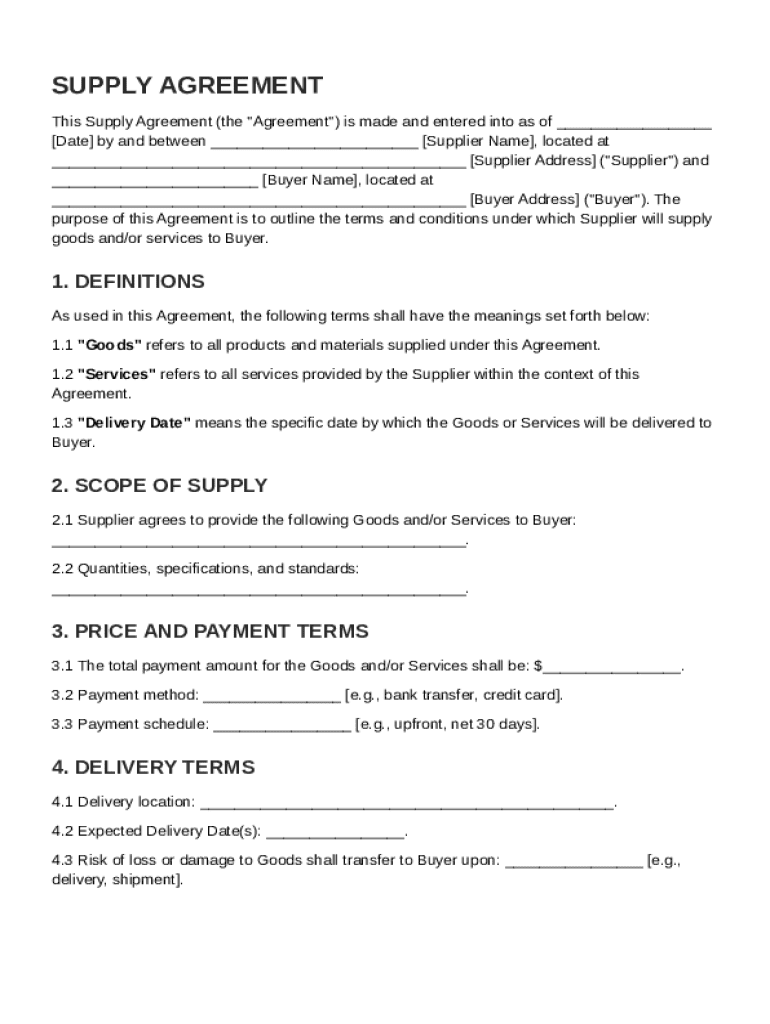 This Supply Agreement outlines the terms and conditions under which a Supplier will provide goods and/or services to a Buyer.
