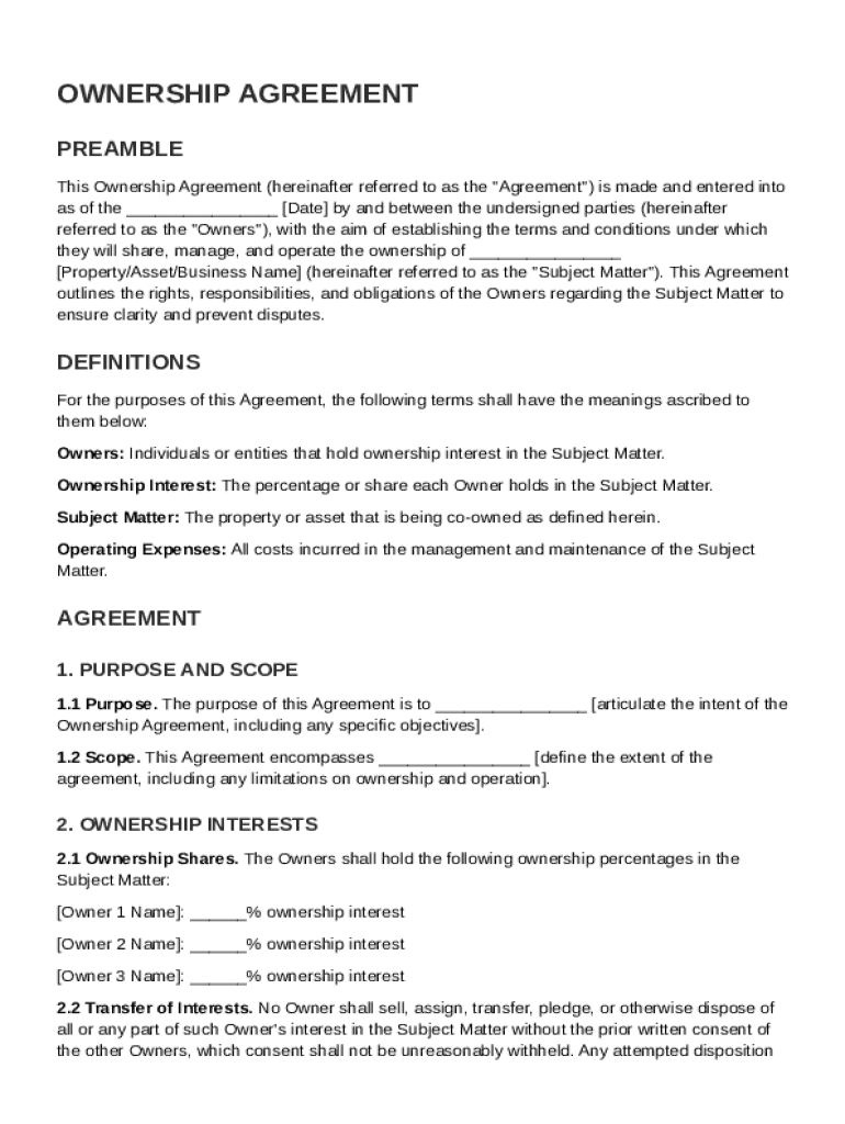 This Ownership Agreement outlines the terms and conditions under which multiple parties will share, manage, and operate ownership of a specific property, asset, or business, detailing rights, responsibilities,