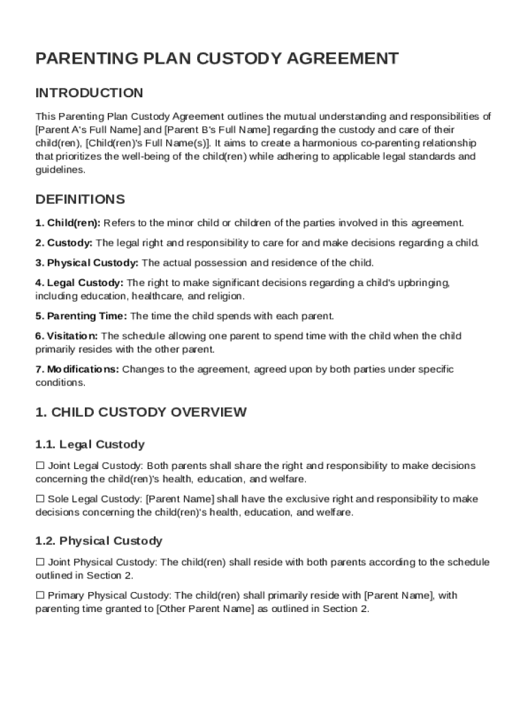 A Parenting Plan Custody Agreement Template is a legal document outlining the arrangement for the care and custody of children following a separation or divorce.