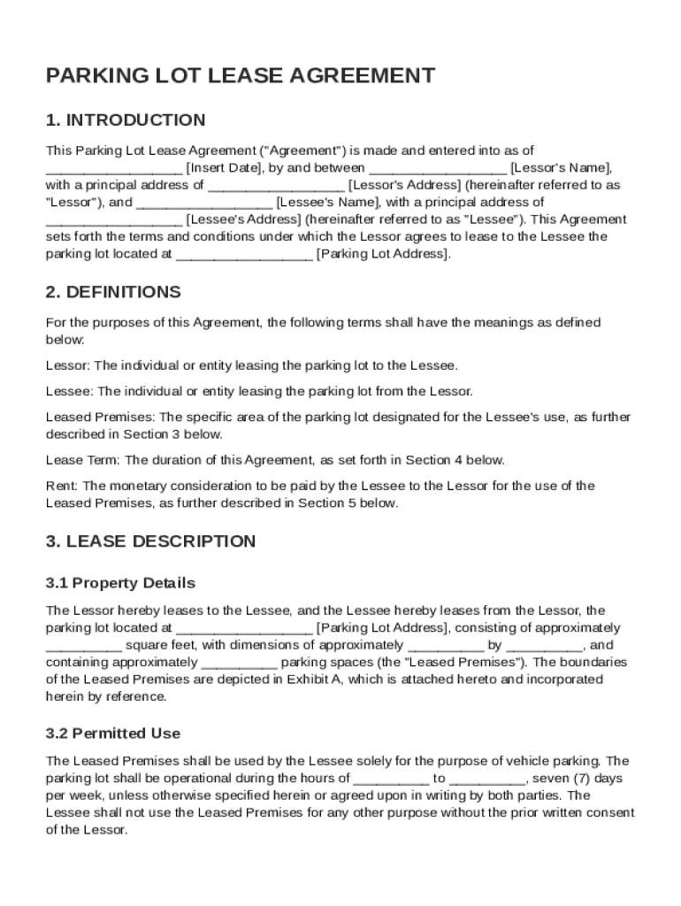This document serves as a lease agreement for a parking lot, outlining the terms and conditions between the Lessor and Lessee including lease duration, rent, responsibilities, insurance requirements,