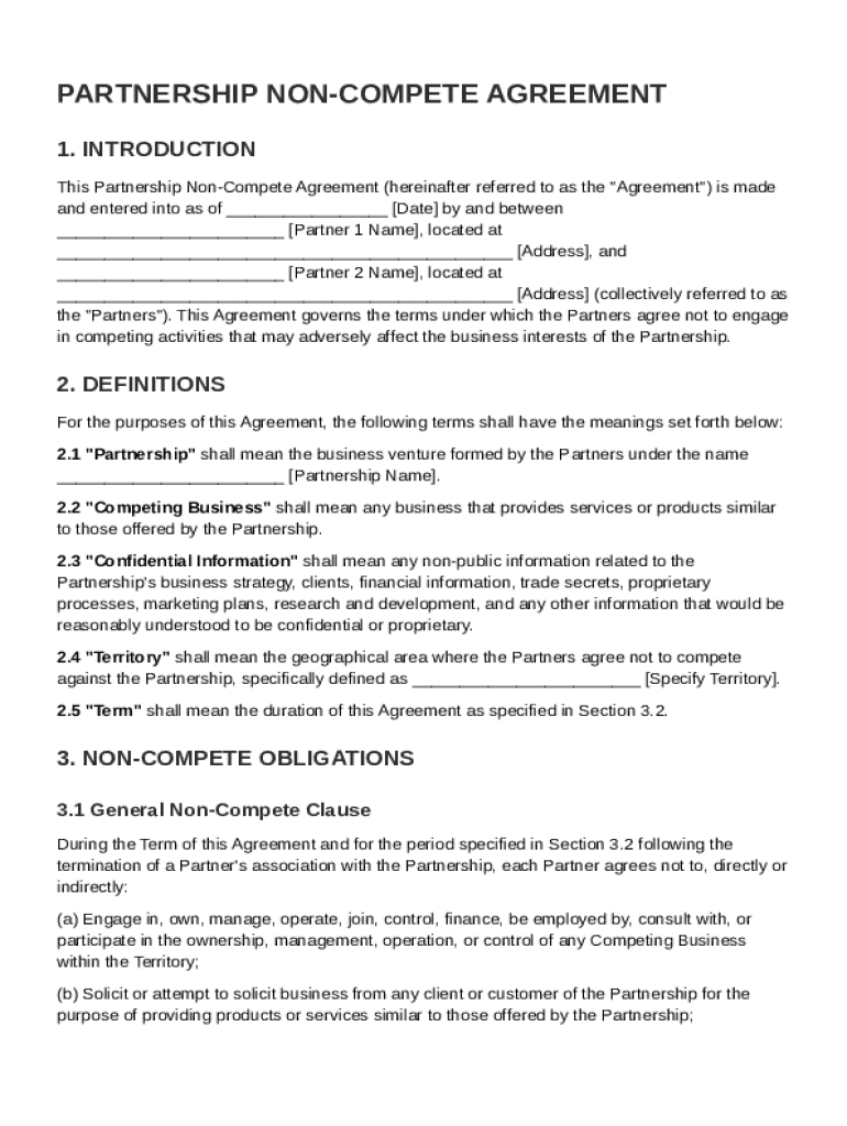 Non-compete obligations form the core of the agreement, laying out the partner's restrictions regarding competition. An understanding of these obligations is critical to mitigate potential conflicts and legal disputes.