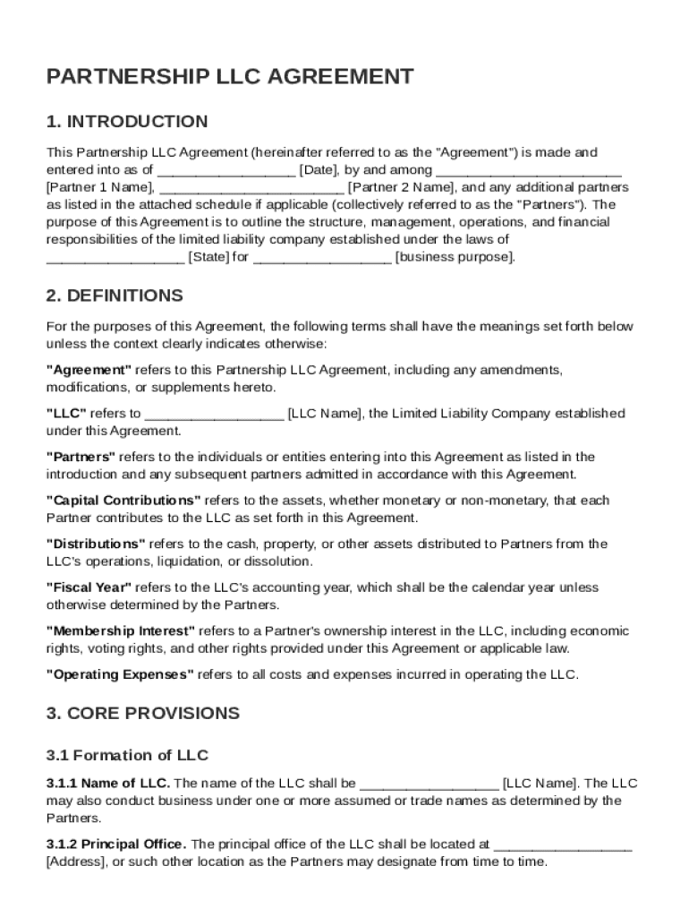 This document outlines the structure, management, operations, and financial responsibilities of a limited liability company formed by the partners as per the laws of the specified state.