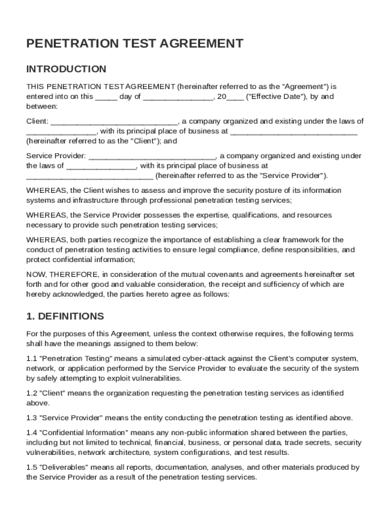 A penetration test agreement is a legal document that outlines the terms, responsibilities, and scope of a penetration test between a client and a service provider. These agreements are crucial in the field of cybersecurity as they provide clarity on what is expected, what is permitted during the testing phase, and how the findings will be handled post-test.