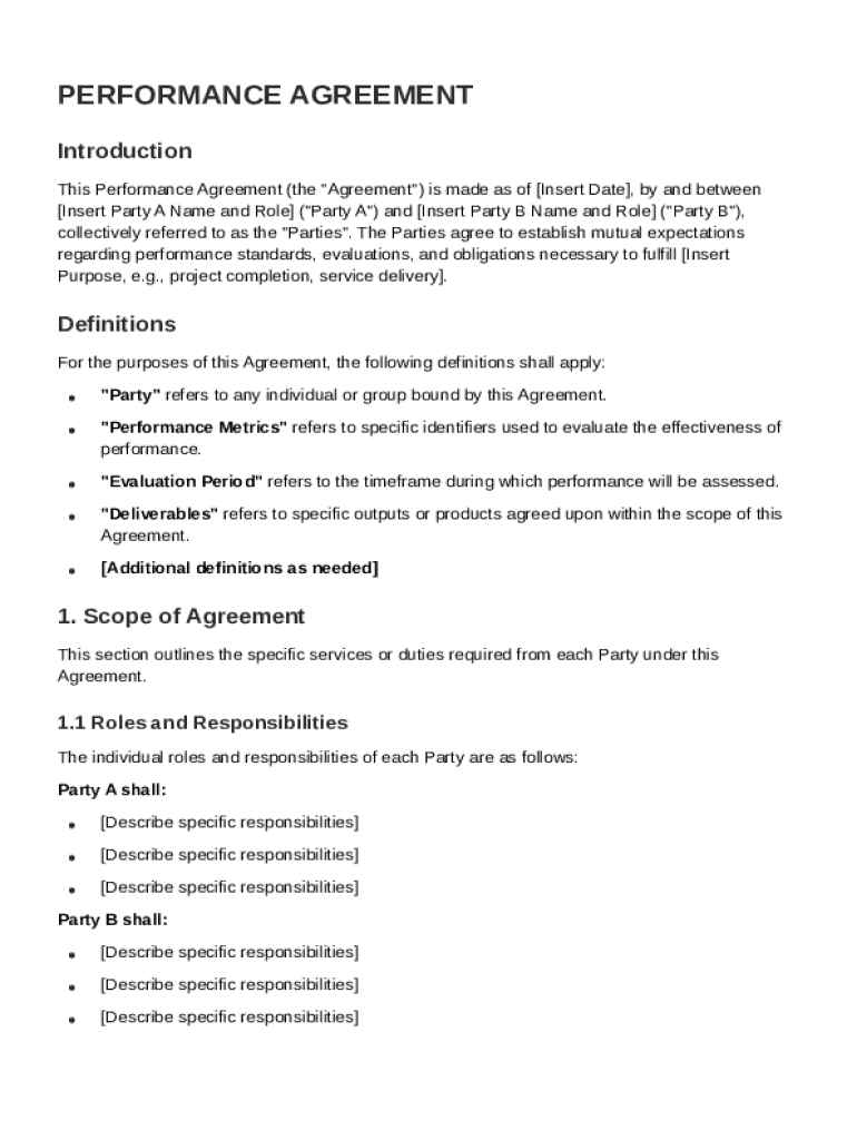 Filling out a Performance Agreement Template form involves understanding key components, defining roles and responsibilities, and setting clear performance metrics. This ensures both parties have a mutual understanding of their commitments and the deliverables expected. By following structured steps provided in this guide, users can create a comprehensive and effective performance agreement.