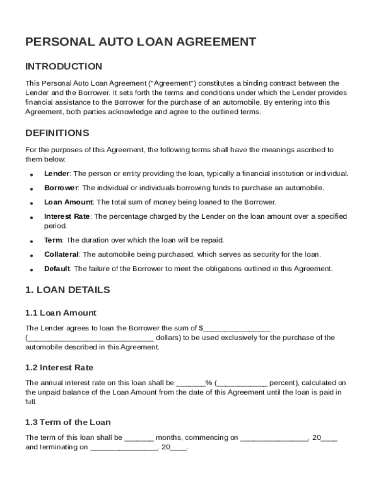 Understanding the core components of the Personal Auto Loan Agreement is essential for both borrowers and lenders. These elements establish the foundational rules of the agreement.