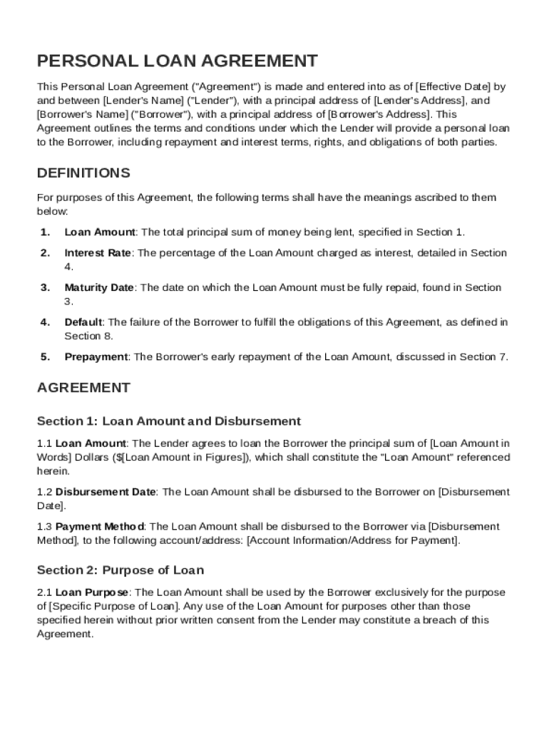 This document outlines the terms and conditions under which a lender provides a personal loan to a borrower, including repayment terms, interest rates, and obligations of both parties.