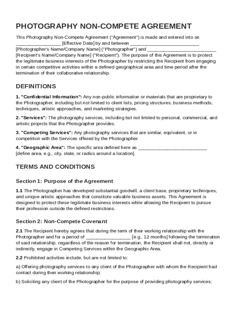 A Photography Non Compete Agreement Template is a legal document that restricts photographers from engaging in competitive activities within a specified area and timeframe after leaving a company or client.