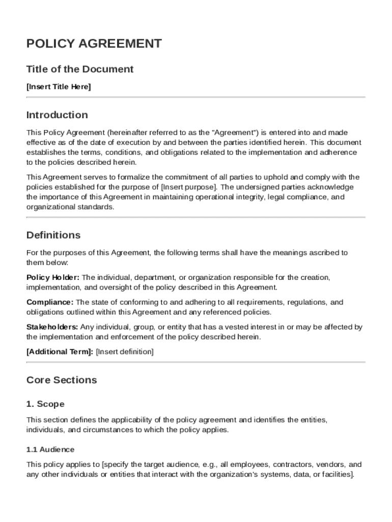 The Policy Agreement Template is a structured form that outlines the terms and conditions agreed upon by two or more parties. It serves to define mutual obligations and expectations within a professional context, and it is essential for ensuring compliance and clarity.