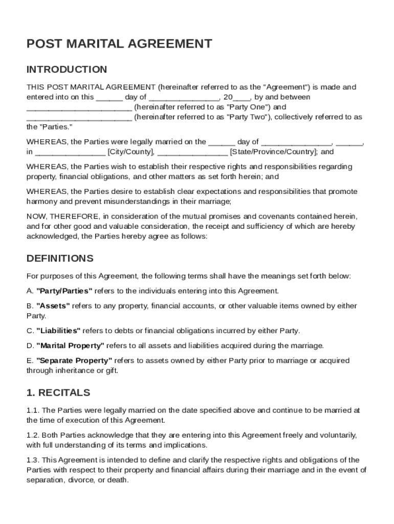 A Post Marital Agreement is a legal document executed by spouses after marriage. It defines the ownership of assets, liabilities, and the division of property, similar to a pre-marital agreement but established when both parties are already committed.
