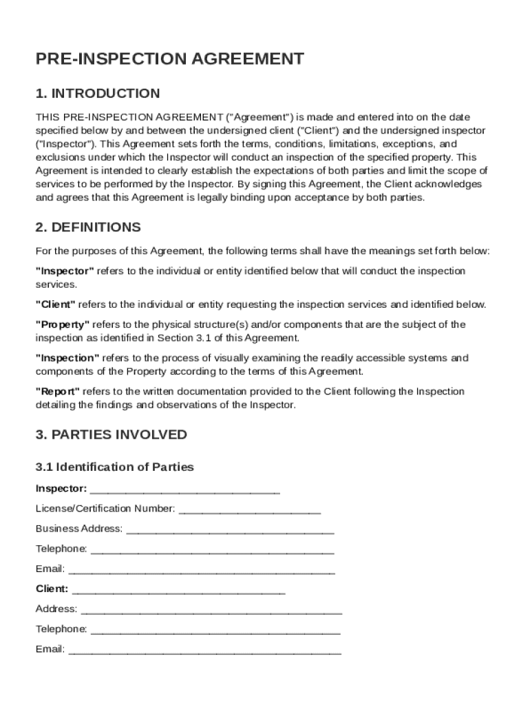 A pre-inspection agreement is a legally binding contract between a home inspector and a client, outlining the terms and conditions of an upcoming property inspection. This agreement ensures both parties understand their responsibilities and protects their rights throughout the home inspection process. It plays a critical role in establishing clear expectations and limiting potential disputes.