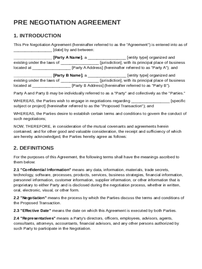 Definition and key provisions of a Pre Negotiation Agreement Template