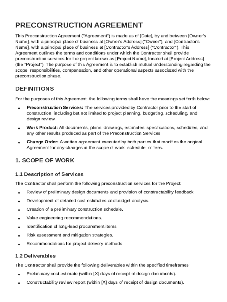 This document outlines the terms and conditions under which the Contractor shall provide preconstruction services for a specified project, establishing mutual understanding concerning scope, responsibilities,